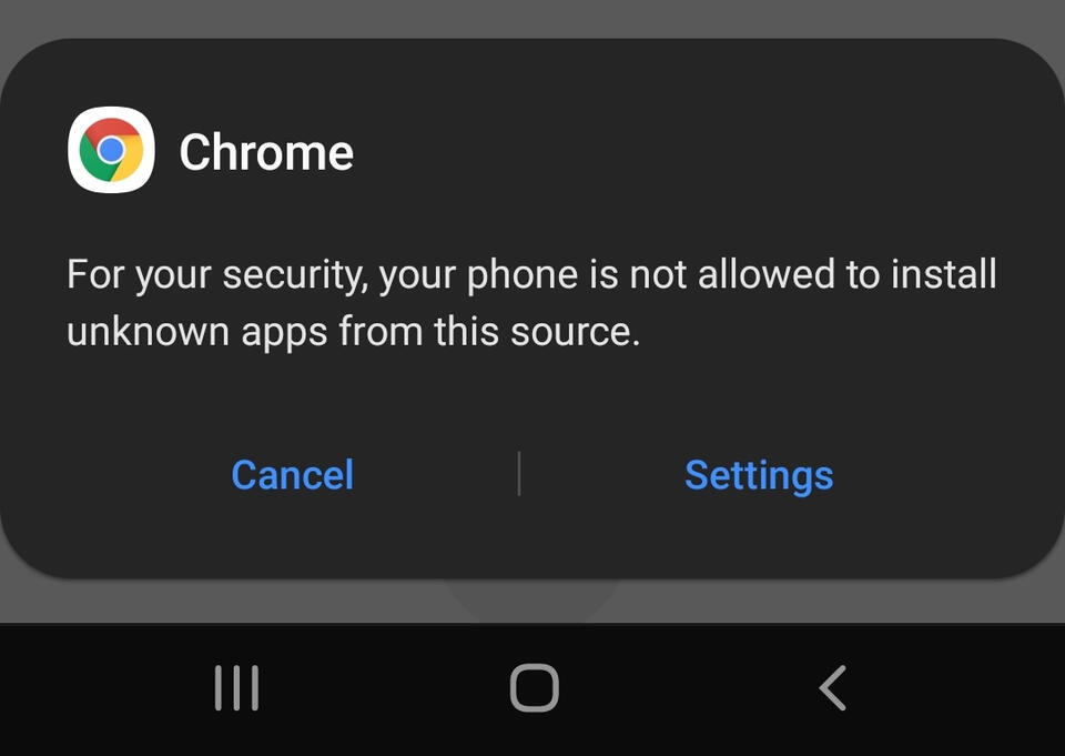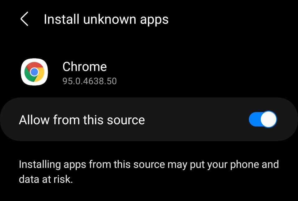 Tap on SettingsThen enable the toggle Allow from this source, on some devices it might be called Allow from unknown sourcesOnce the toggle is enabled go back using the back button ( < )